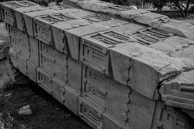 La mayor de todas las estelas alcanzó 33 m, y está derrumbada. Como todas ellas, tiene una falsa puerta labrada en la parte inferior y una sucesión de pisos con ventanas (también falsas) y un remate semicircular de significado desconocido.